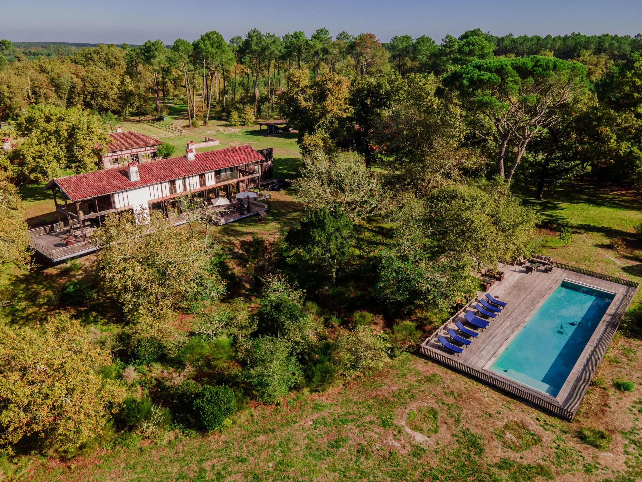À chaque pas, vous serez transportés dans une atmosphère chaleureuse et contemporaine, au cœur d’un domaine de 15 hectares de nature préservée, entouré par la forêt landaise.